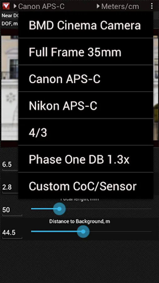 Visual DOF Pro app supports some most popular cameras / sensors: