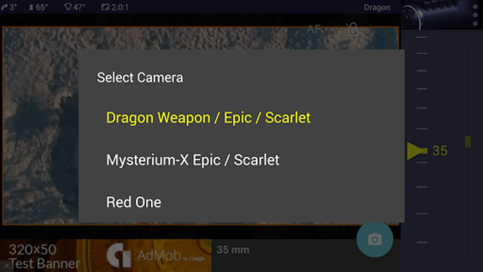 The app is a digital director's viewfinder -- it helps you see the exact field of view for your future shot. Select the camera from the menu and rotate the wheel to select the focal length of the lens.