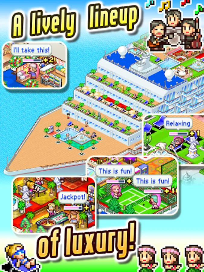 Put the right facilities next to each other and you'll score big points with passengers and reviewers. Amass enough fame and even celebrities will come flocking when you're in port!