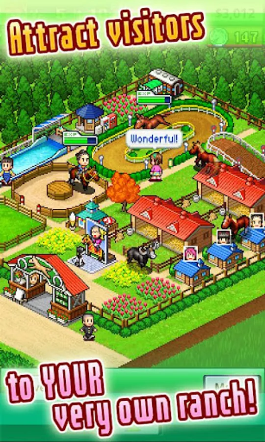 Build training facilities like dirt courses and pools amidst the beautiful natural surroundings of your ranch. Increase your ranch's fame and entice visitors to spend some dough at your ranch's amenities, like ice cream stands and gift shops.
