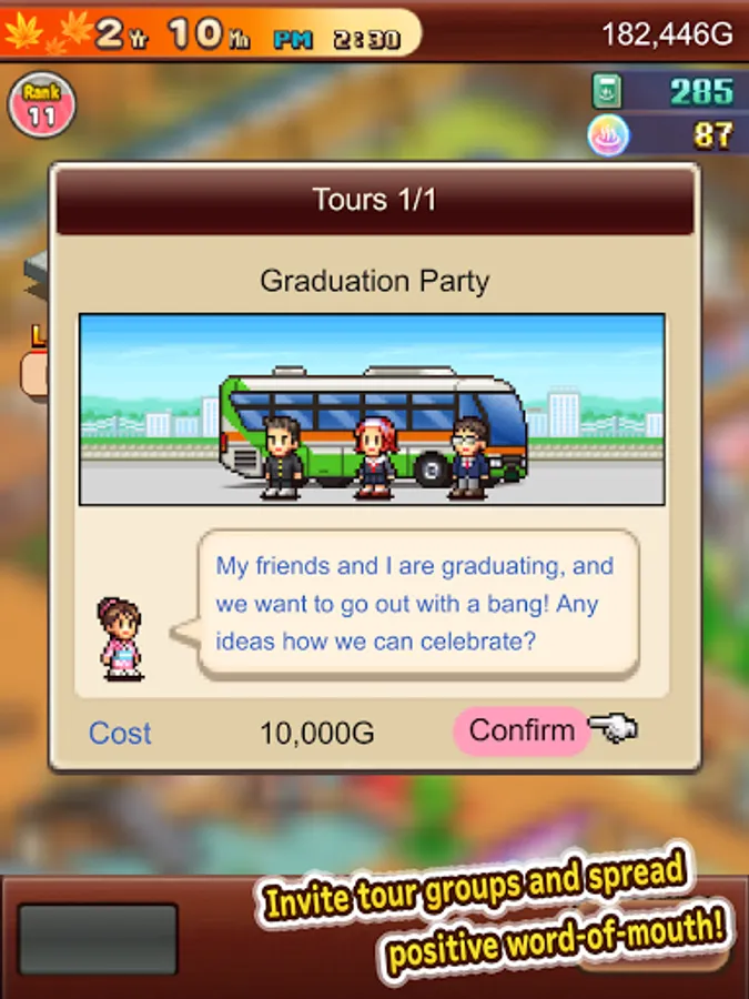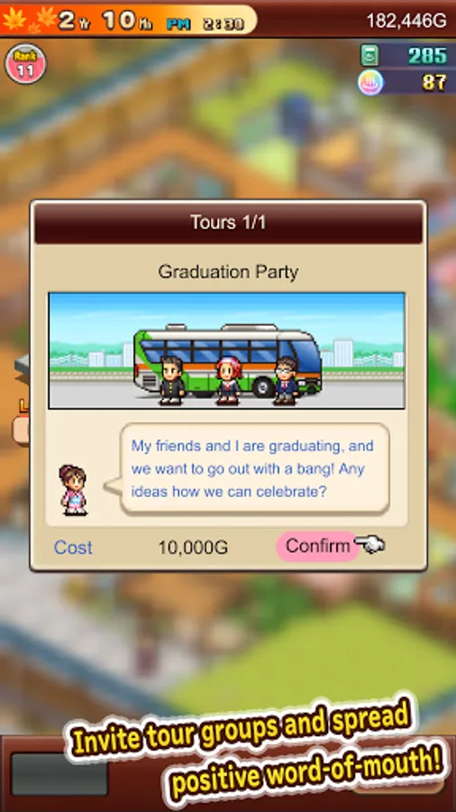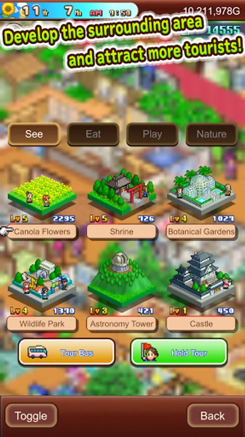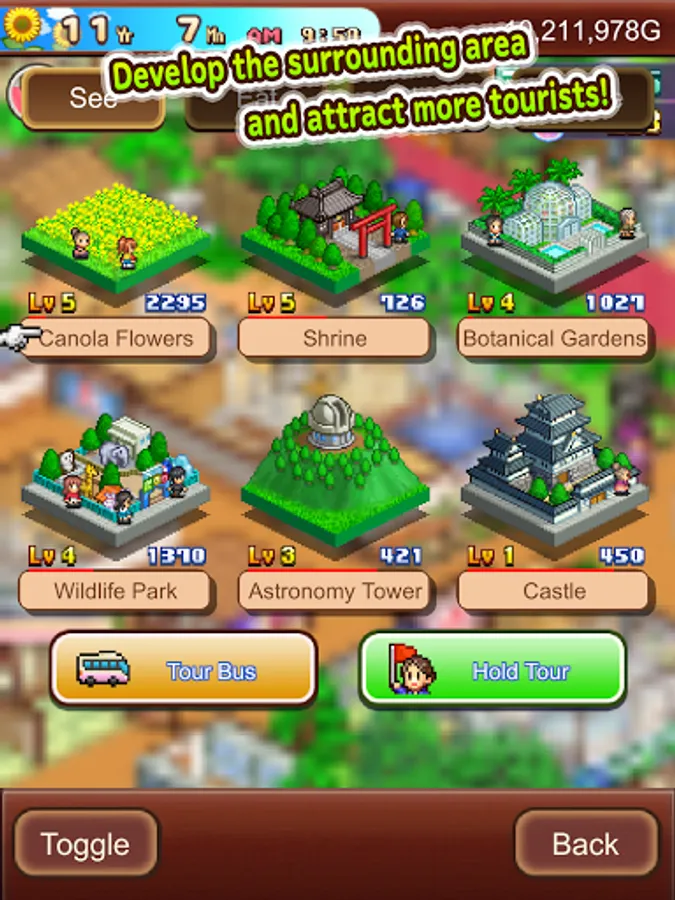 Help develop the local area by investing in different tourist attractions. Will you promote the Soothing Forest? A bustling Amusement Park? Maybe even an all-year round Ski Slope?
