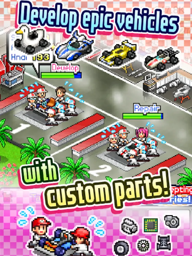 Develop new vehicles and parts, and customize them any way you like! Do you have what it takes to make it to the winner's circle?