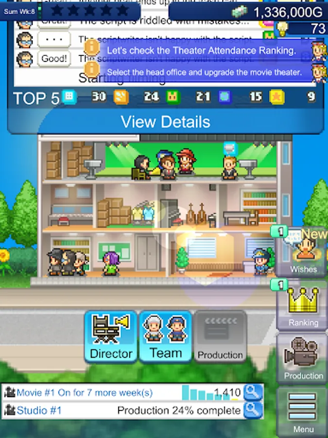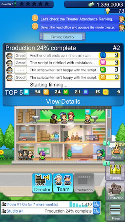 Customize your studios with facilities such as a CG or sound studio, staff cafeteria or acting school.