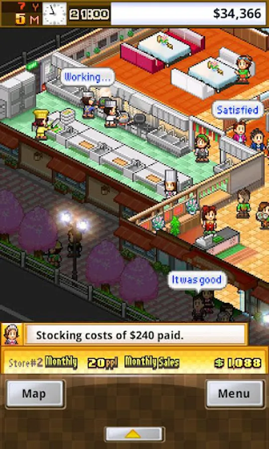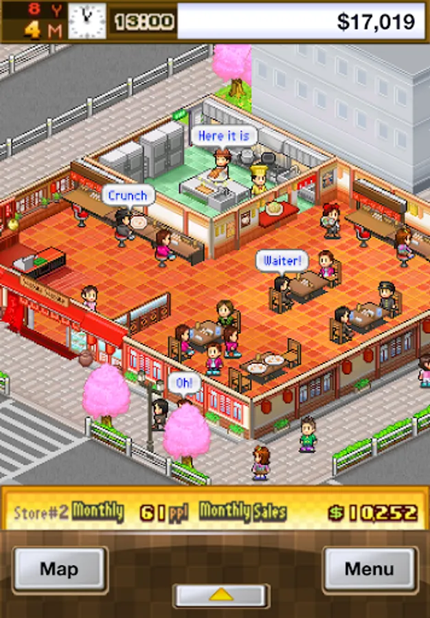 Decide every detail of the floor from tables to TVs and do whatever it takes to make your customers happy! After all, their ratings determine whether you're chef...or sap. Score enough points and you'll be able to host a variety of fun events from eating contests to cooking classes, further boosting your popularity!