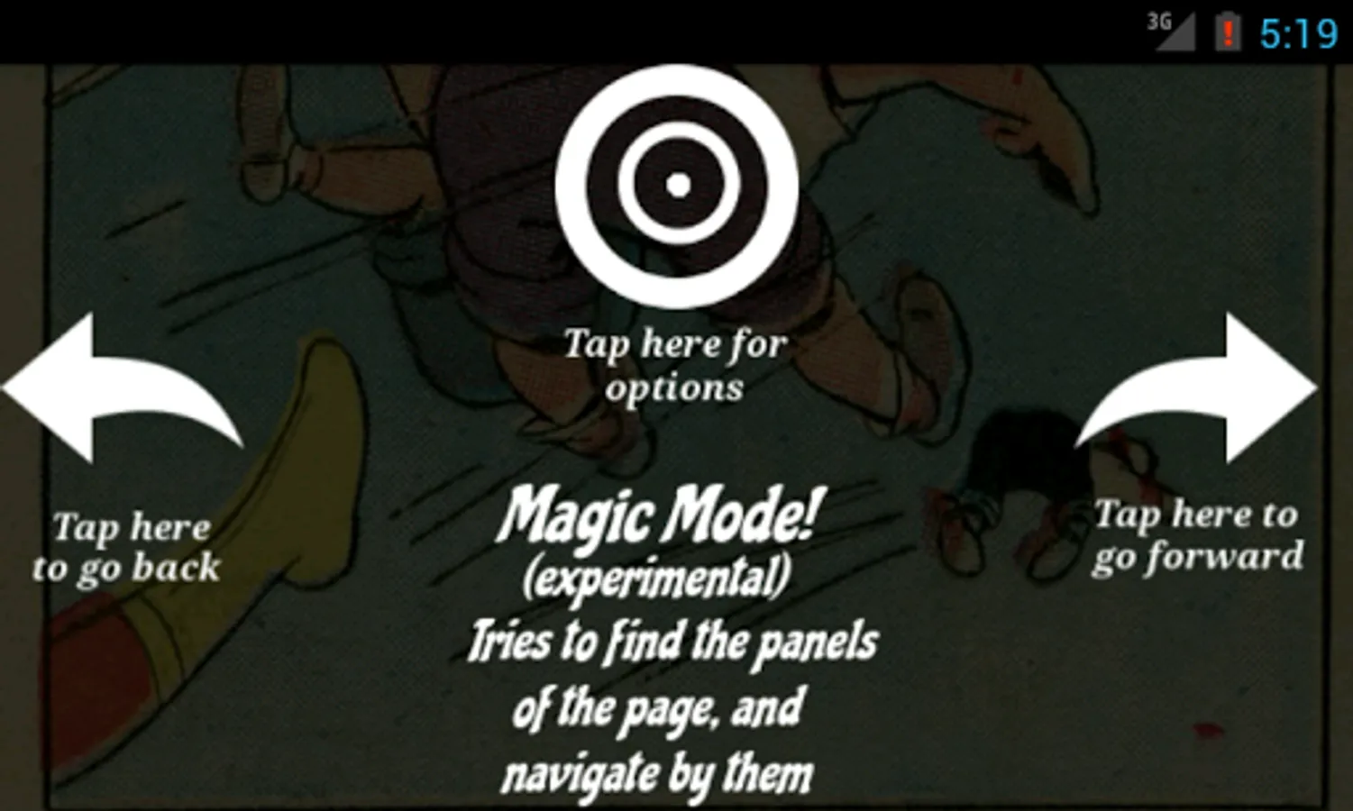- The magic mode is an experimental feature, that tries to detect the panels of the page, and navigate by zooming them. In some comics the detection is awesome, in some comics doesn't work at all.