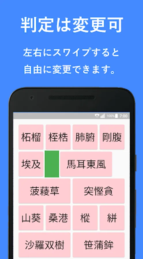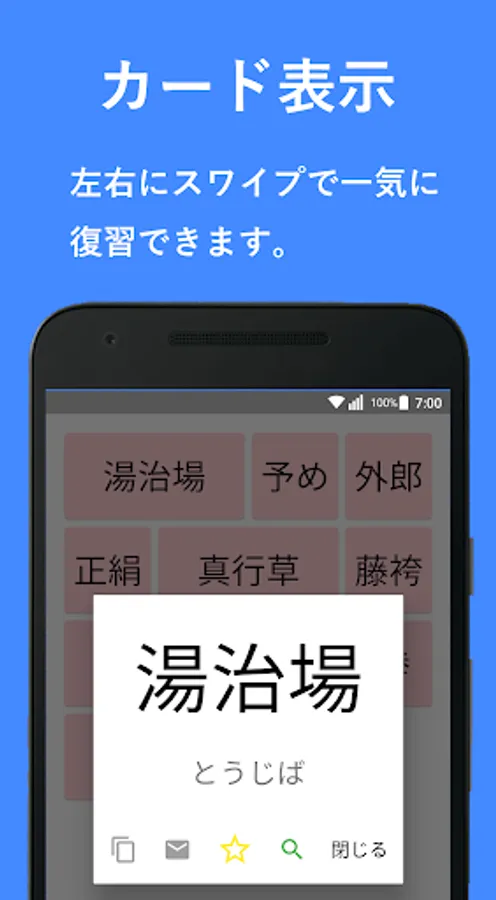 There may be typos in the questions. You can report errors by e-mail from the application to the author. Even if there are multiple reading methods, only one reading method is correct. Please search and check each time. You can change the judgment result with left / right swipe. This application is provided without warranty as is. Please use on your understanding.