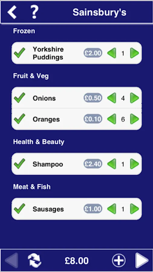 A few sample products, shelves and stores defined by default together with two shopping lists. These can be deleted if you wish. It is recommended that you add all of the products you wish to use before adding them to you shopping lists but of course stores, shelves and products can be added to at any time.