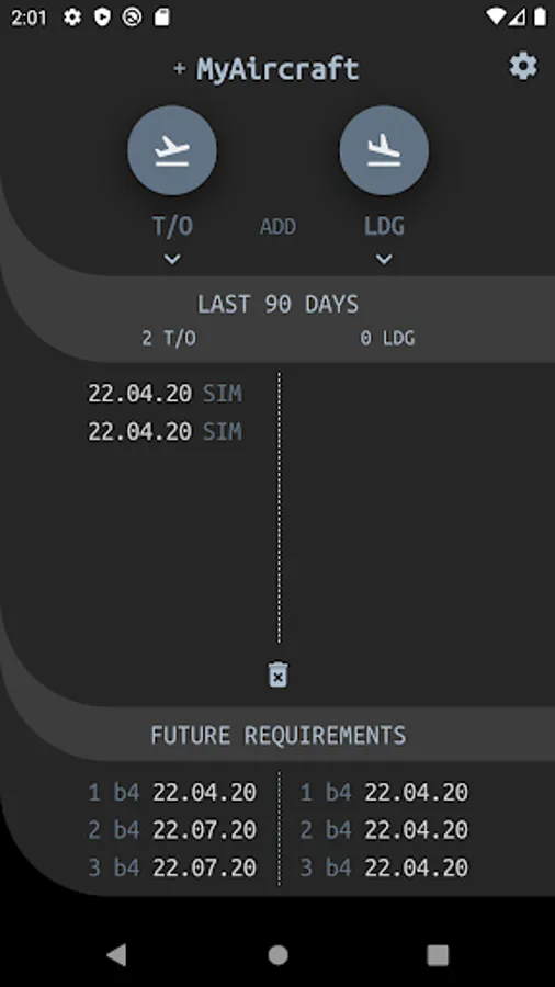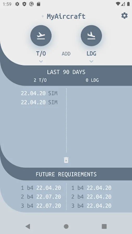 In aviation, to be allowed to legally operate an aircraft in commercial air transport or carrying passengers, you need 3 takeoffs and 3 landings in the preceding 90 days on that aircraft type. By entering the dates of your takeoffs and landings, this app gives you an easy to interpret preview of when your next ones are due.