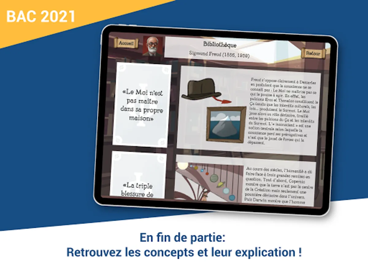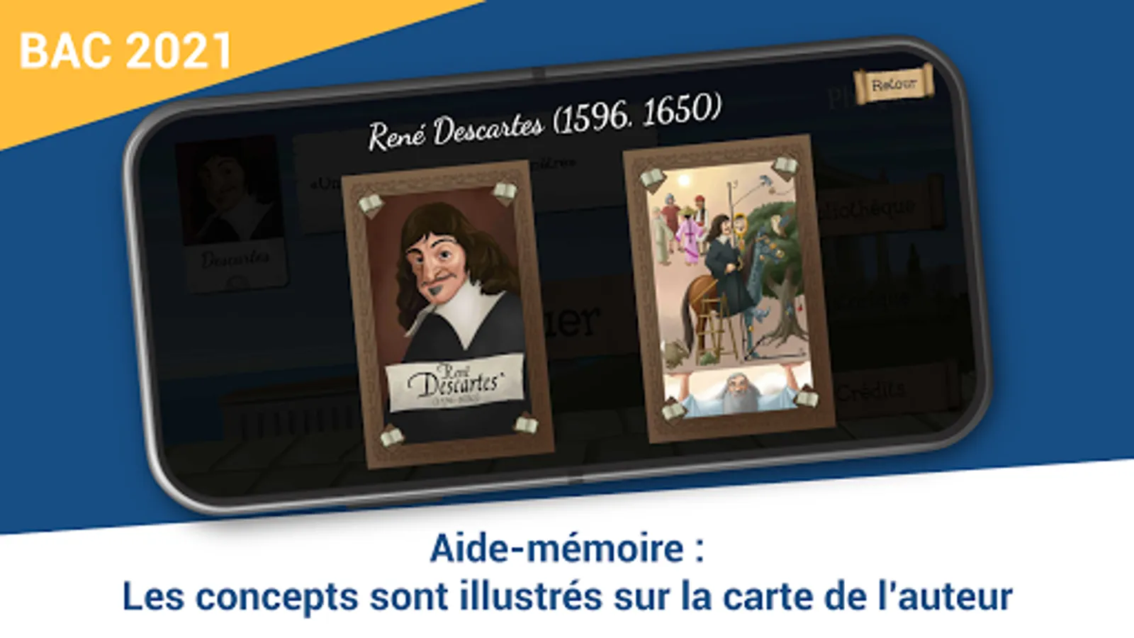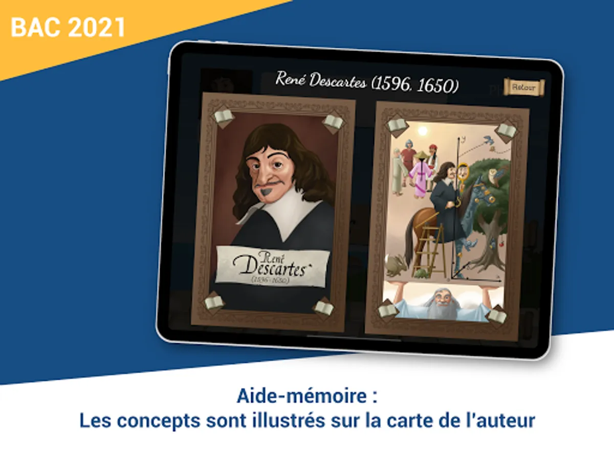 With the digital application, I invite you to find the universe of the card of each philosopher with the 7 concepts which correspond to it. By reading the content, designed as review sheets, you make the connection with the illustration and the drawings and you easily memorize the whole.