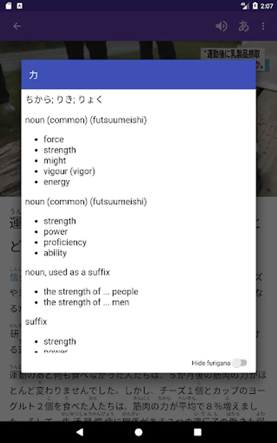 * Tap on kanji to get English translations from a built-in offline dictionary