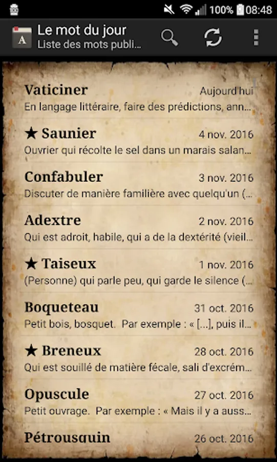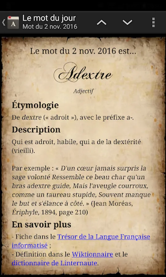 More information about the application and FAQ on the developer's website: http://kevinvuilleumier.net/android/le-mot-du-jour/