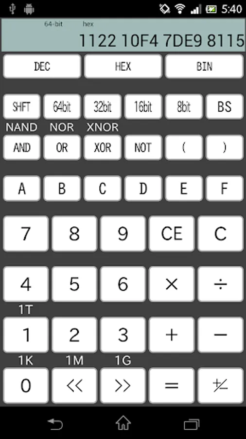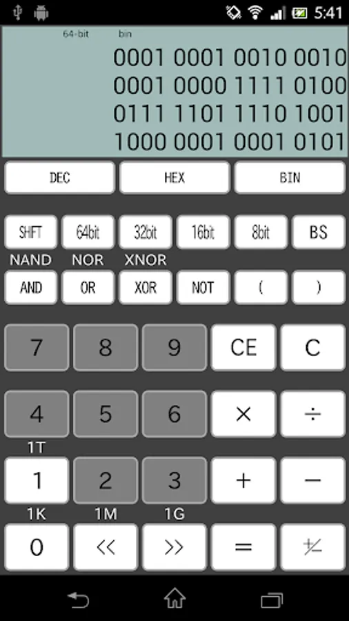 - bit shift keys('<<' and '>>' keys) in bin and hex mode.