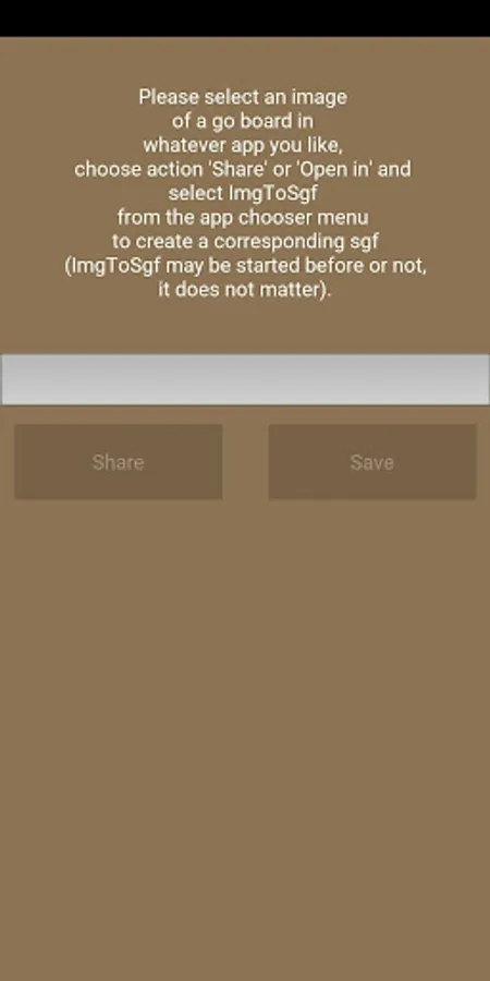You can choose an image of a go board in whatever app you like (e.g. a photo just taken with the camera or a screenshot), then tap action "Share" or "Open in" and select "ImgToSgf" from the app chooser menu. This app will then create an sgf file describing the situation on the go board (as set stones).
