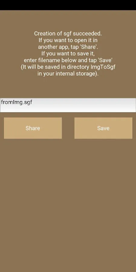 You may then open this sgf file in another app (e.g. an sgf editor or an AI analysis engine) by tapping "Share" or save it to your internal storage by tapping "Save".
