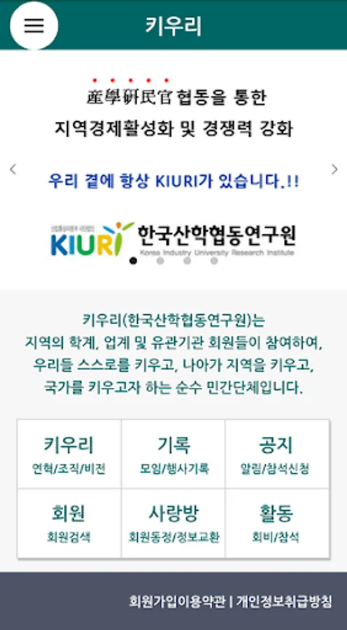 Kiuri (Korea Institute for Industry-Academia-Industrial Cooperation) is a purely private organization that voluntarily participates in local academia, industry, and related organizations and operates as a member's dues for joint goals. Therefore, we are excluding any political problems or interference and involvement, and we seek to revitalize the regional economy and strengthen our competitiveness through industry-university cooperation among our members.
