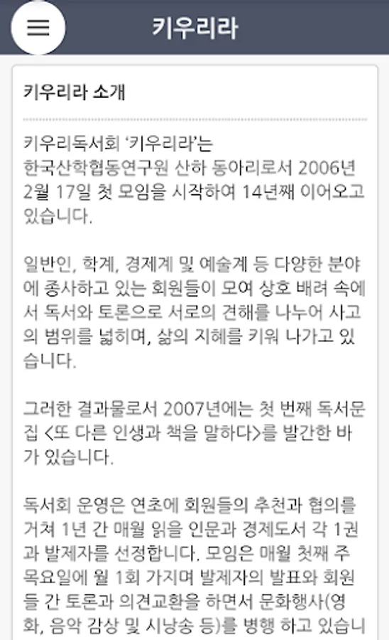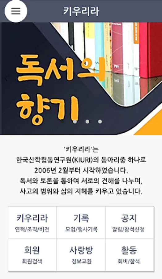 The Kiura Reading Society is one of the clubs of the Korea Research Institute for Industry and Academic Cooperation (KIURI), which began in February 2006.