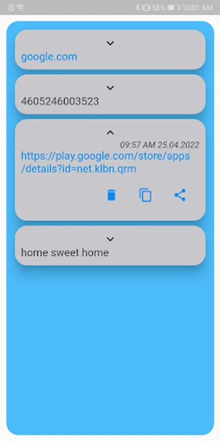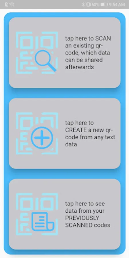 The application gives an opportunity to get info from various types of barcodes, include quick response codes (also known as QR). Extracted info can be shared instantly or later as all data stores in device memory.