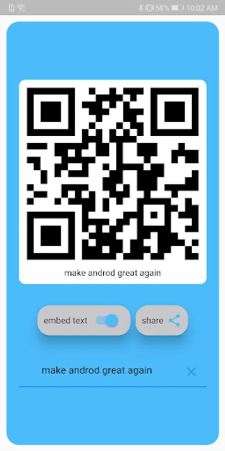 Using the app you will be able to create you own QR-code from any text data. Created code can be easyly shared as image over email, bluetooth or whatever your device allows.