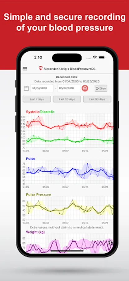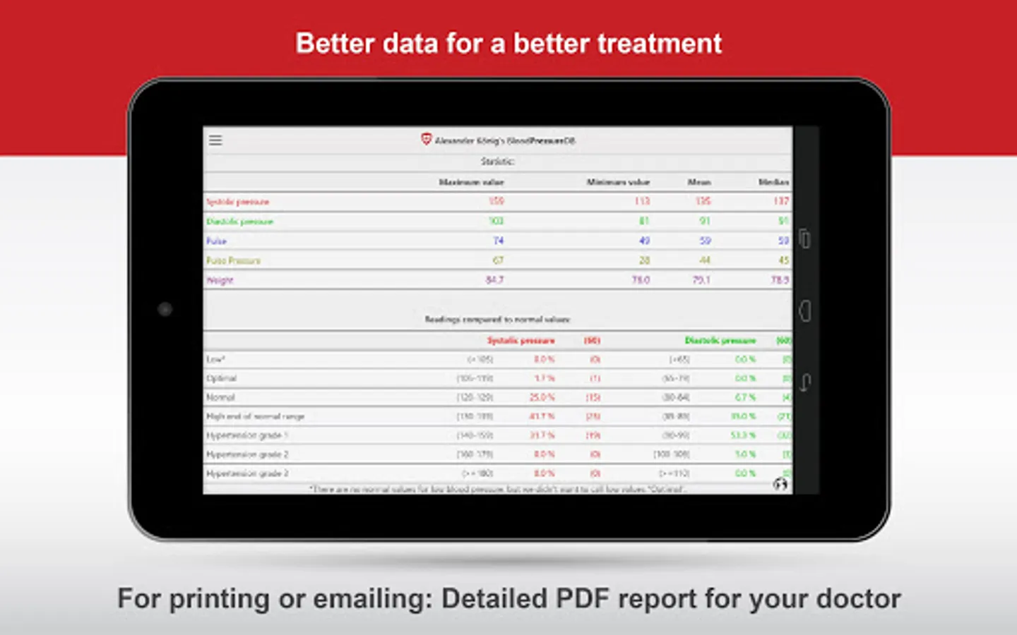* Helpful charts and statistics about your arterial pressure that can be commented for future analysis