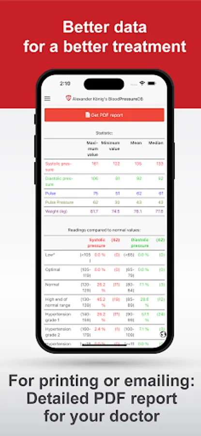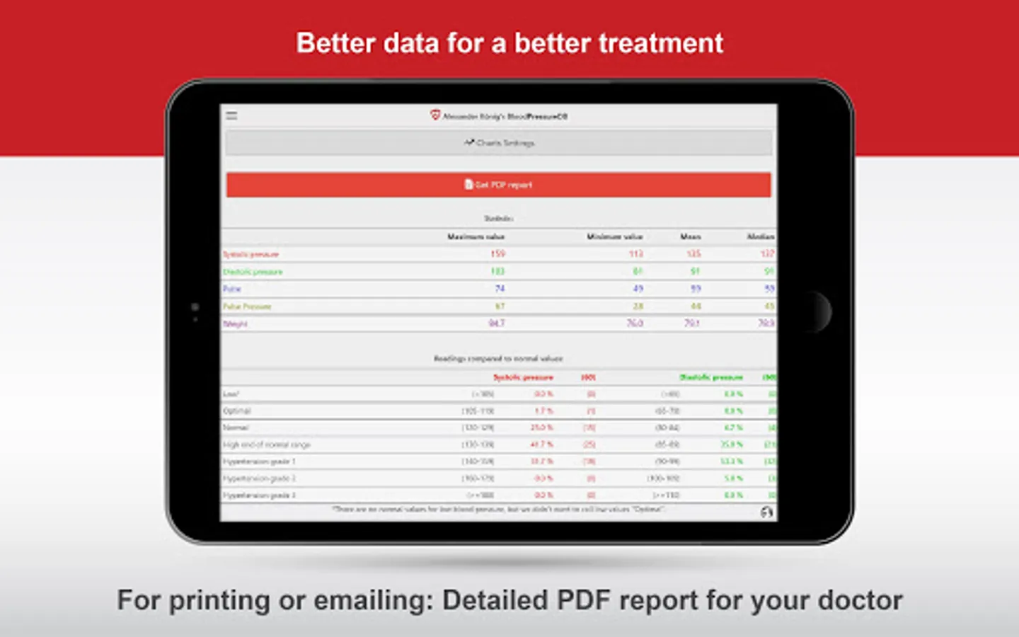 * Detailed PDF report with chart for a given time range for consultation with your doctor. To email or print