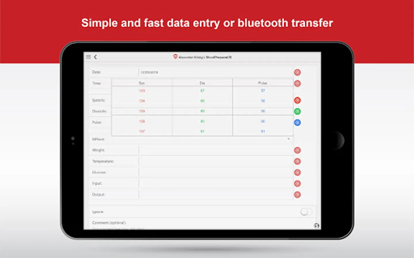* Easy record and store your systolic and diastolic blood pressure together with your pulse at a given time