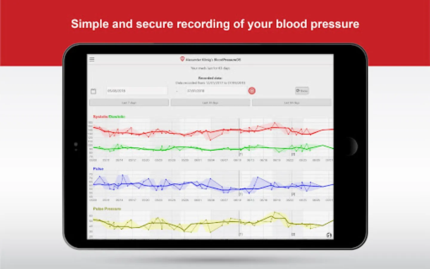 Now you can have your blood pressure under control everywhere. Track, monitor and store your blood pressure (systolic and diastolic) along with your pulse, blood sugar and more. As a patient tracker the app is recommended for people with hypertension, high blood sugar, diabetes, high blood pressure and who have an increased risk of heart attack, you can even track your body temperature.