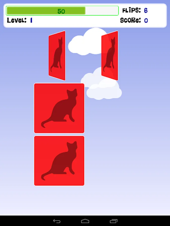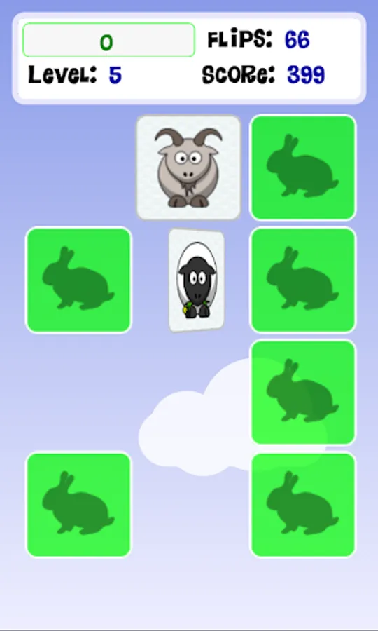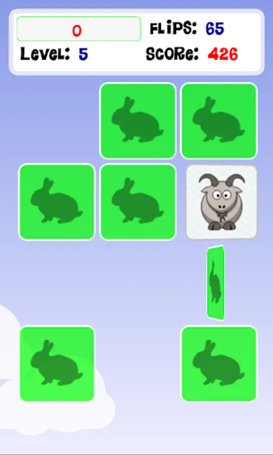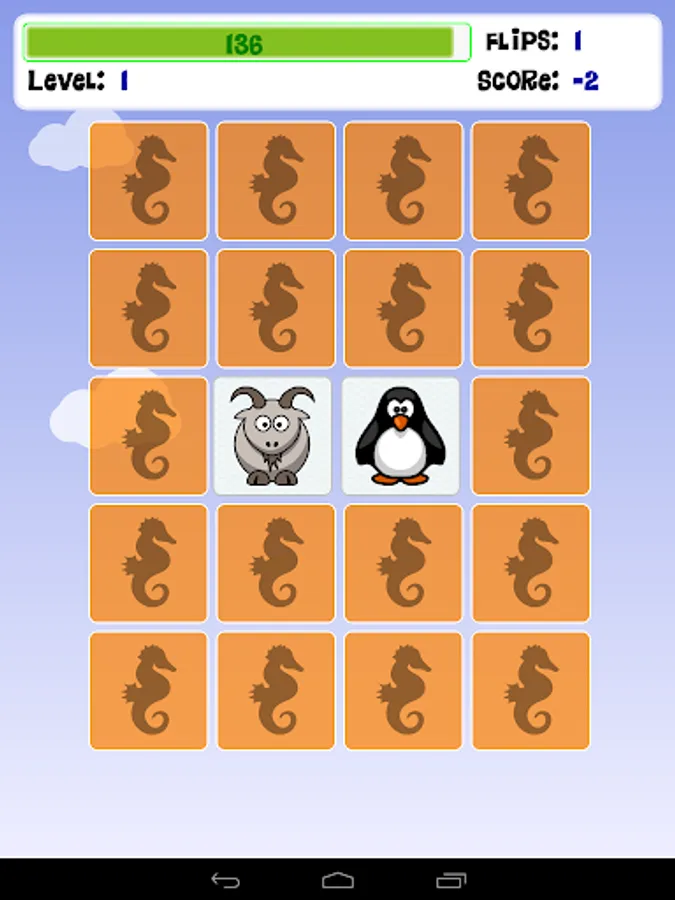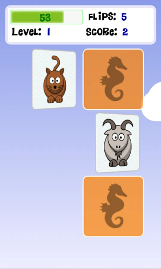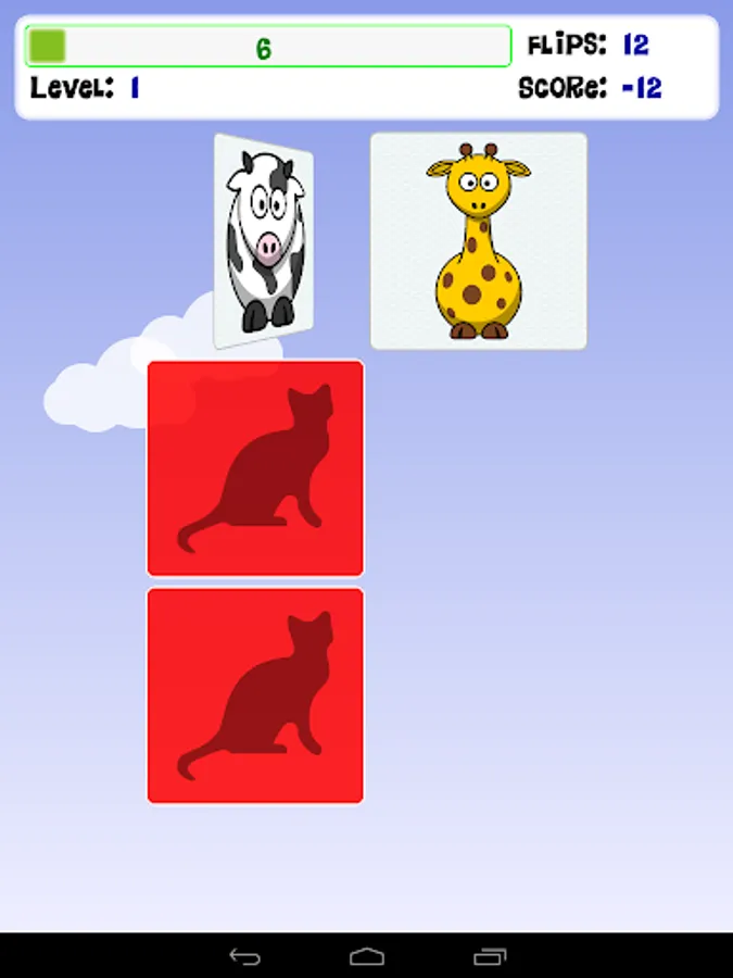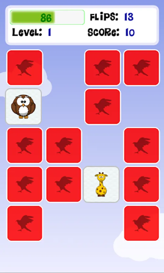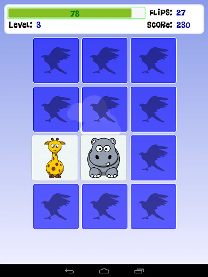 There is a number of cards hiding images of animals. Tap to see card's face. Only two cards can be rotated at once. Find pair of matching and they will gain score and disappear. Get bonus when you complete a puzzle. Remove all cards in time. Higher level - lower time. Save time - get score. No time - spend score. The most fun begins when little time available. The game lasts while you have time or score points. Get the top level you can!