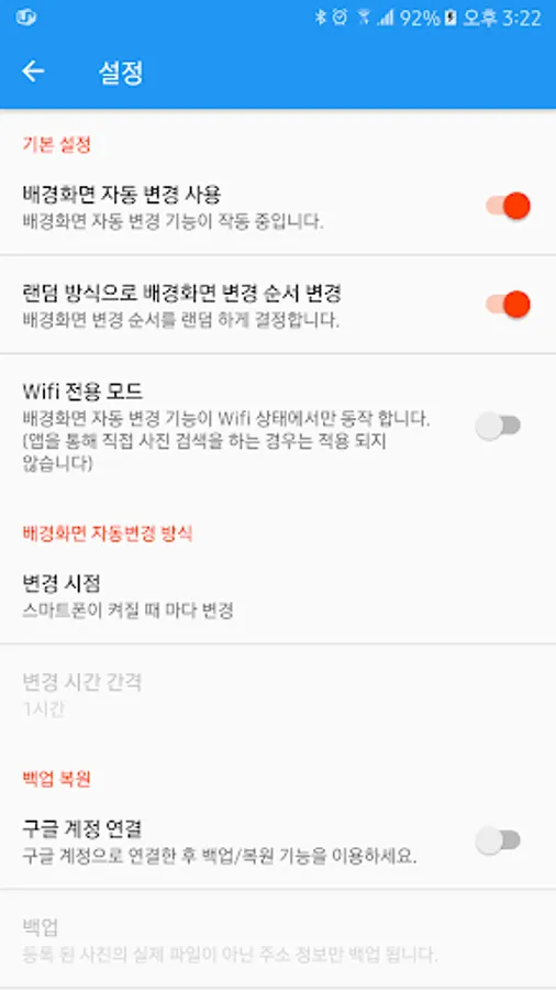 : 스마트폰을 사용할 때마다 "배경사진 목록"에 등록된 여러 사진 중 하나를 랜덤하게 배경화면으로 자동 변경합니다.