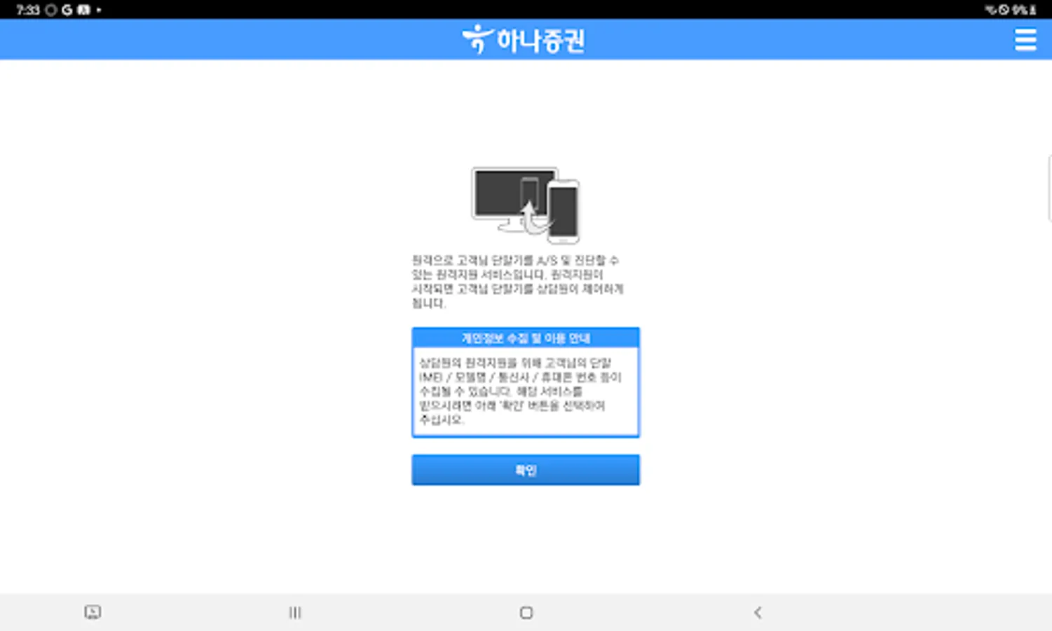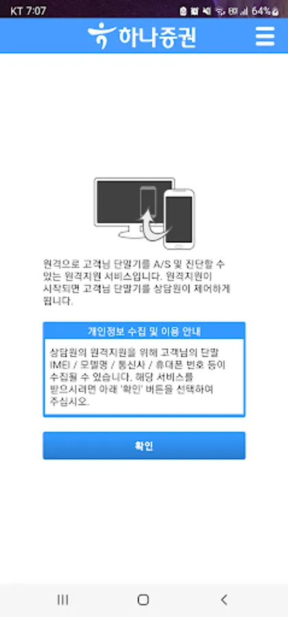 Hana Securities remote support provides complete support for a variety of mobile devices with proven technology from various angles, allowing customers to remotely view the screen with their own eyes without having to visit the service center with more than a mobile device.