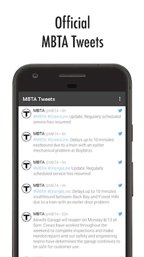 - twitter feed with official @MBTA, @MBTA_CR and @MBTATransitPD tweets