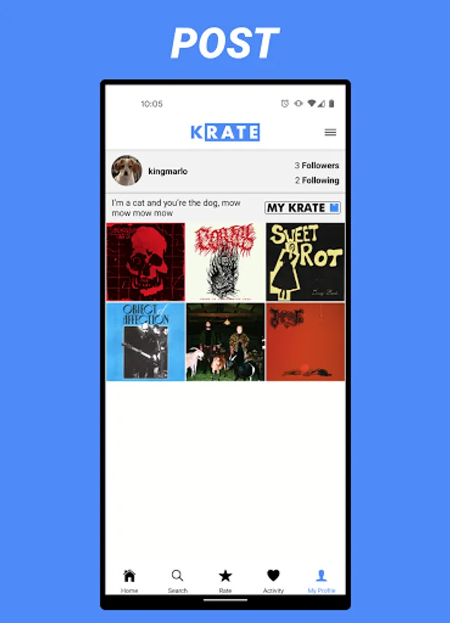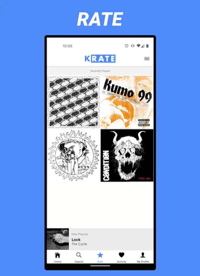 A social networking app bringing together music fans that allows you to rate Albums, Singles, and E.P.s from Spotify. Rate what you are listening to (or have listened to) out of five stars. Additionally, you can write a review to be included with your rating on each post. Follow other users and friends to see what they are reviewing and listening to. Add albums to My Krate and save them for future listening.