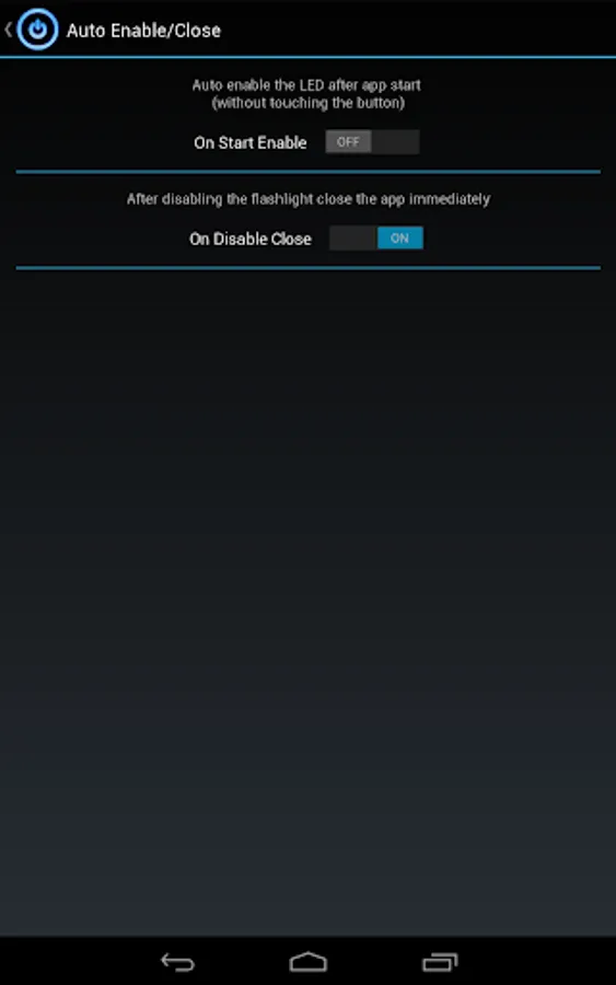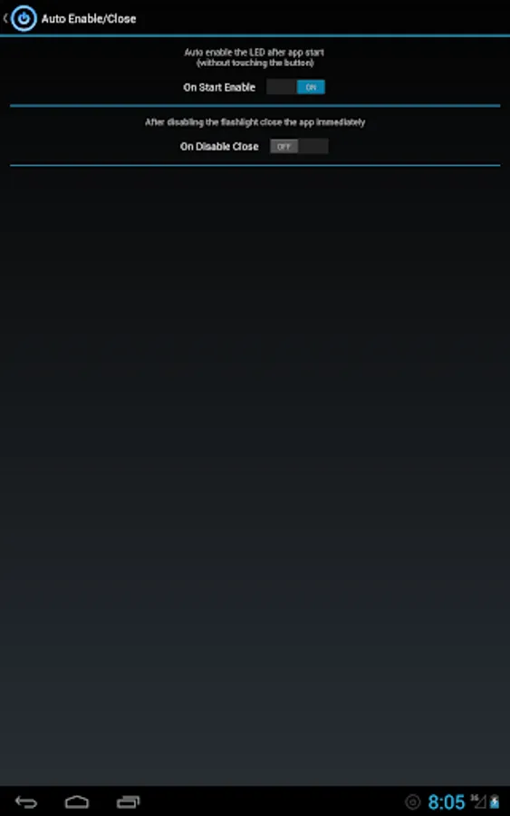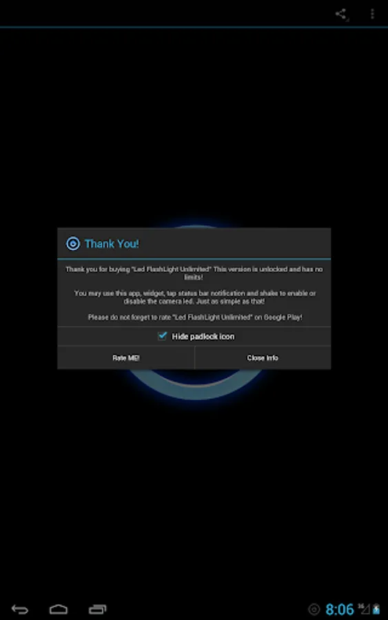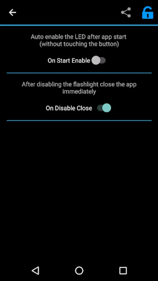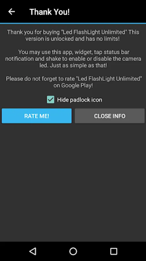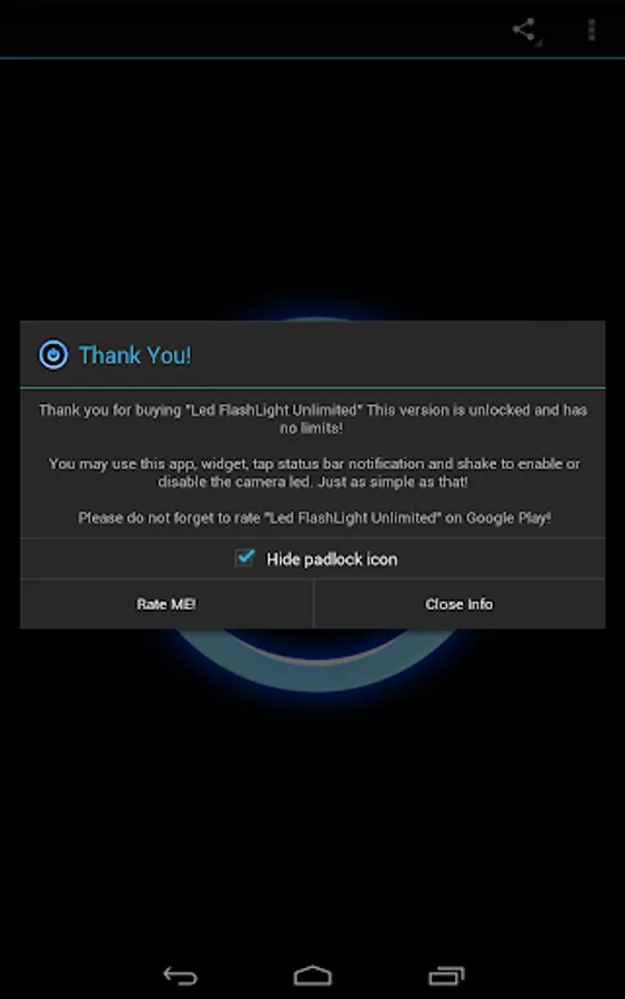 "Unlimited" version do not show the message asking about the upgrade and it has "Shake To Disable" and "On Start Enable" functions integrated. Other functionality is the same as free version. If you like "Led Flashlight" please support future development by buying this app! Thanks!