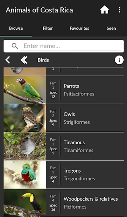 Navigate through taxonomic ranks or use the search bar to find species of interest. Mark species you have seen during your trip and find out about their morphology, similar species, biology, ecology, behavior and distribution.