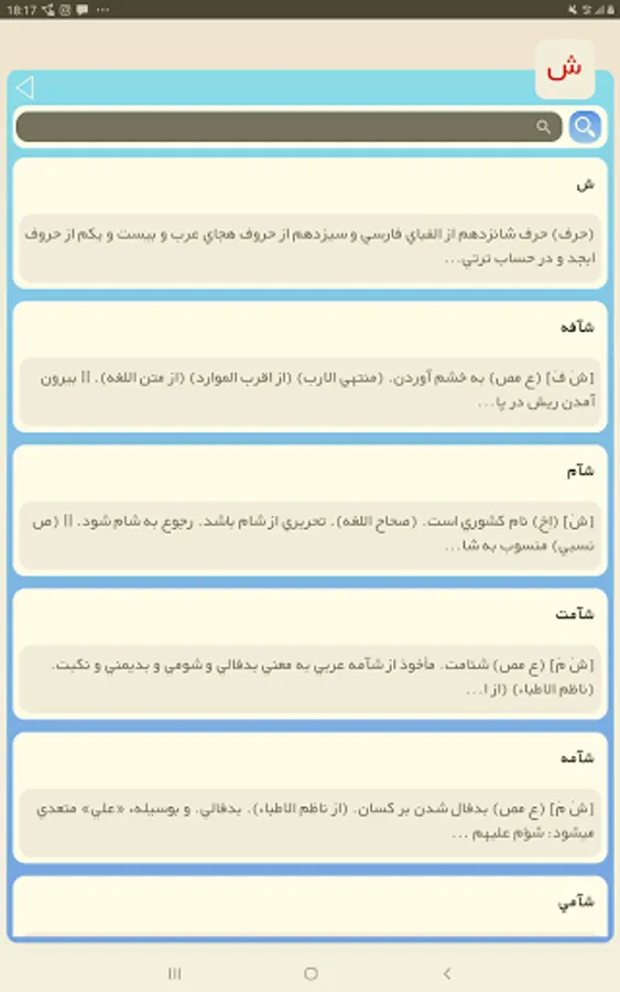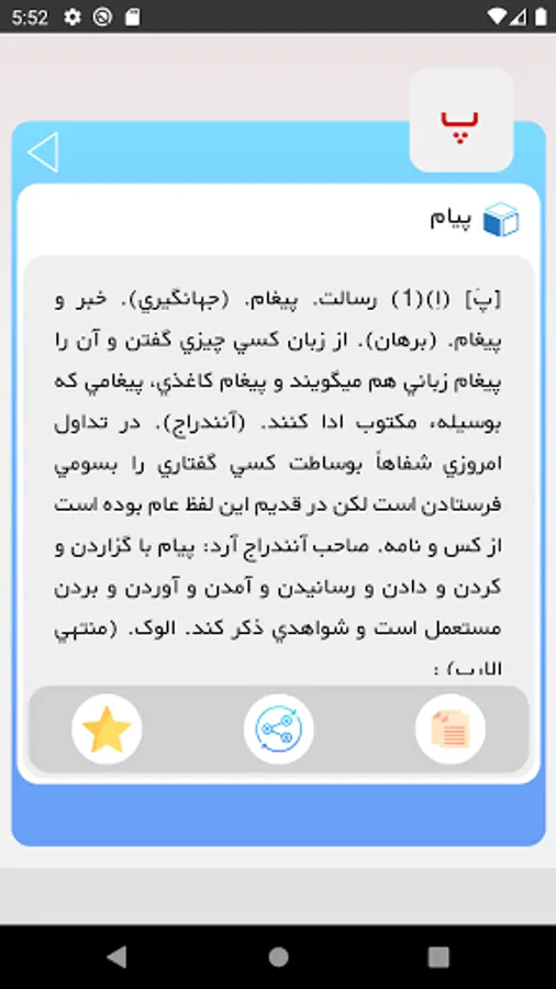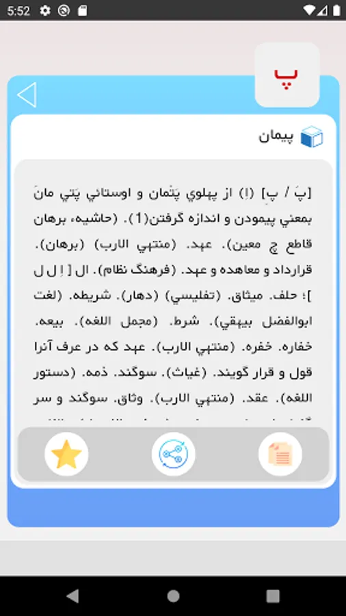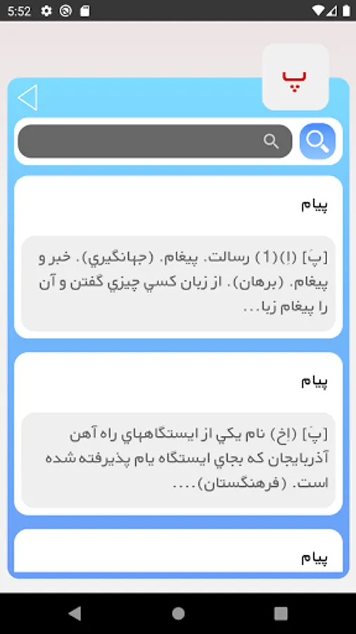 In Dehkhoda online dictionary application, you can quickly see the meaning and relevant explanations by entering any word in the specified section and pressing the search button.