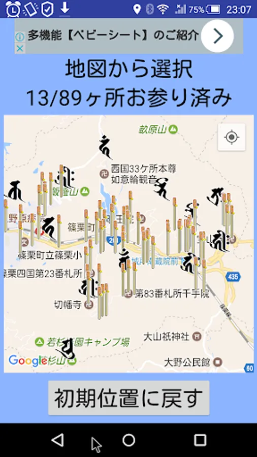 地図上から札所を選ぶ機能はお参り済みの札所をご本尊の梵字で表示するようにしています。