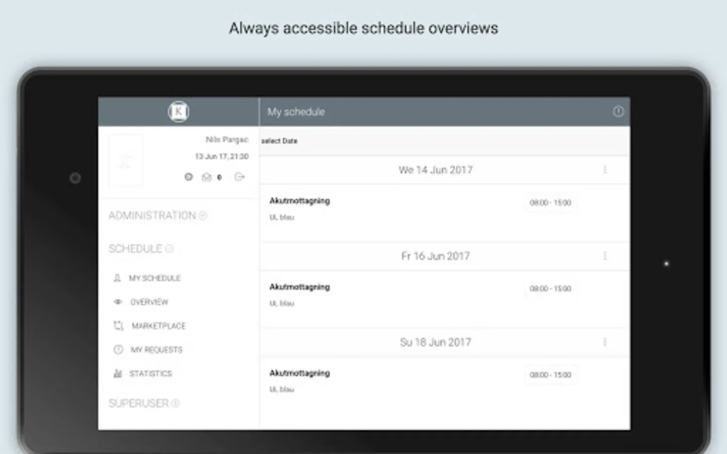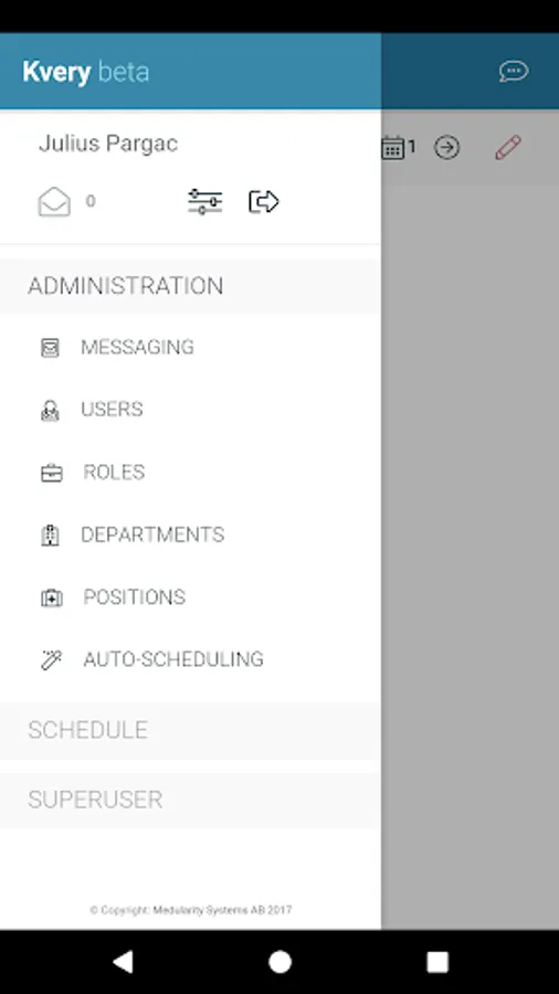 This is a companion app integrated with the Kvery Scheduling Service. It provides access to personal and team schedules. It furthermore allows communication between users.