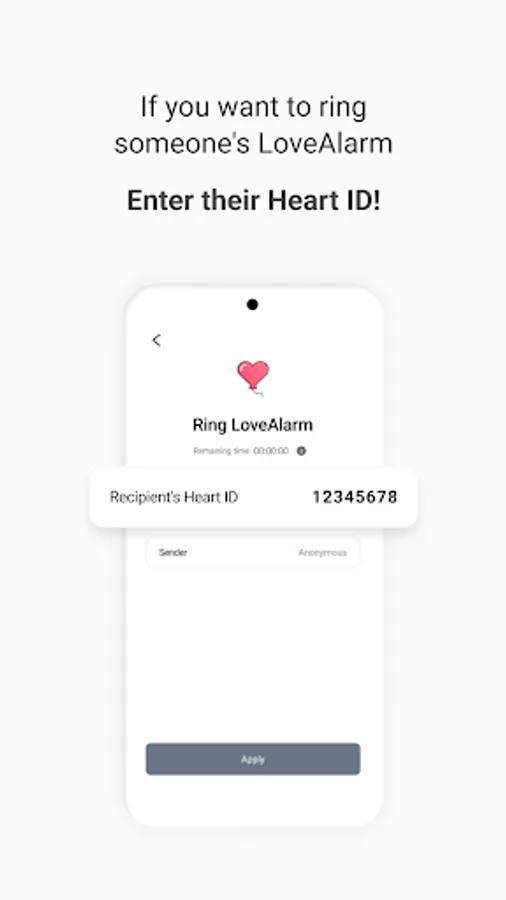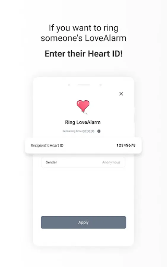 Enter the other person's Heart ID to ring their LoveAlarm, and share your Heart ID to others to receive a LoveAlarm.