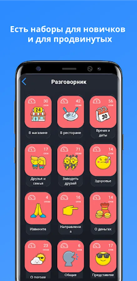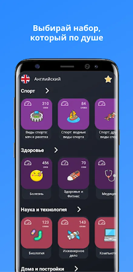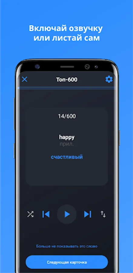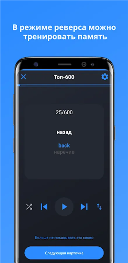 1. Training mode. First, a word in a foreign language is shown, then you can turn the card over and see the translation, or turn on the pronunciation of words.