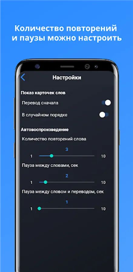 You can adjust the pauses between words, the number of repetitions of a word, shuffle the words in the set and select the mode: