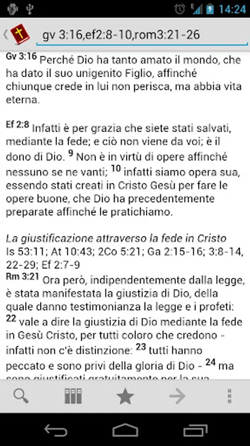 With this program you can read the text of the Bible and search for words and phrases in the text. There are also bookmarks, favourites, and sharing. The program includes the Nuova Riveduta translation, and in the program you can download and install four other Italian translations (C.E.I., Nuova Diodati, Riveduta/Luzzi, Diodati), several translations in other languages, and many commentaries.