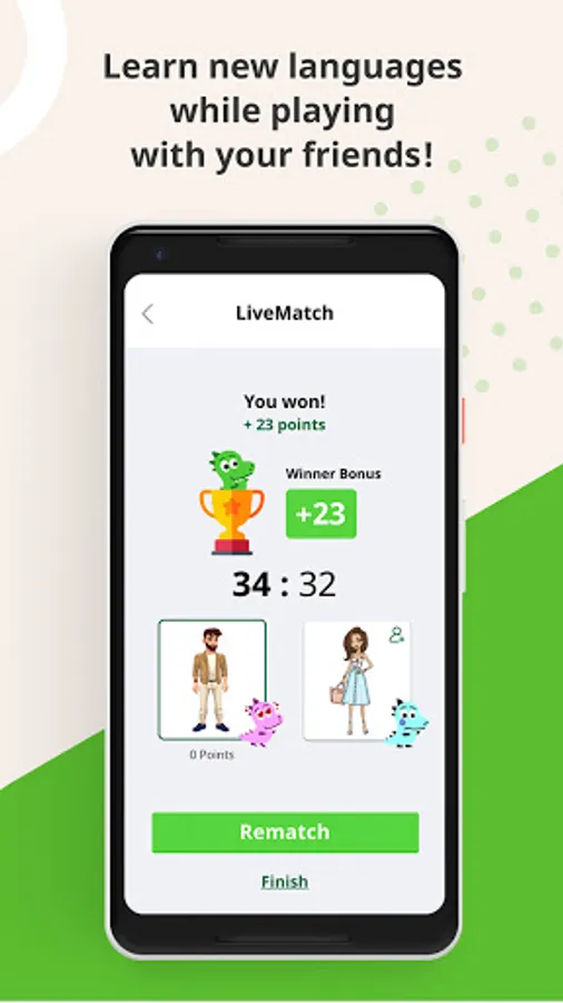 - Play with friends in real time in a LiveMatch: challenge your friends to fun, interactive vocabulary games called LiveMatches – simply invite them via WhatsApp/Messenger/Email/text message. Language learning comes naturally when it’s embedded in a playful context. LiveMatch is the most amazing feature! Everyone loves LiveMatch. Challenge your friends now!