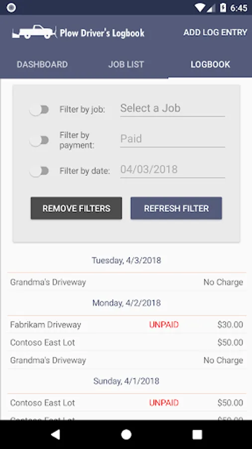 • Filter your logbook by job, payment, or date