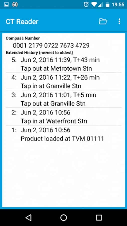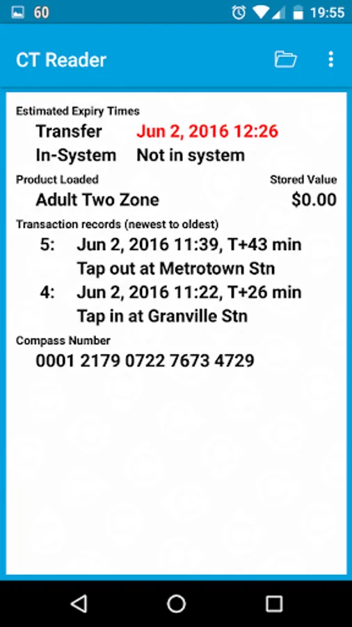 CT Reader is an NFC reader app that displays data from TransLink* Compass Tickets, as used on buses and SkyTrain including the Expo, Millenium, and Canada Lines. A design feature of CT Reader is to display only the data stored in a ticket; no connections are ever made to the Compass web site.