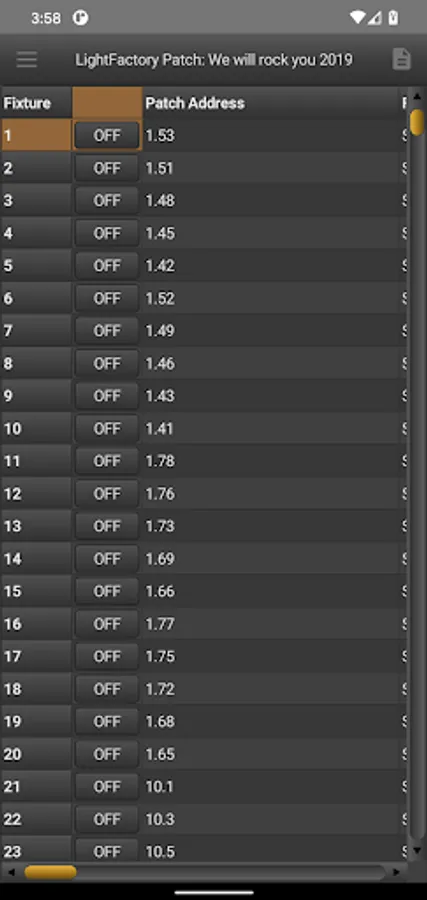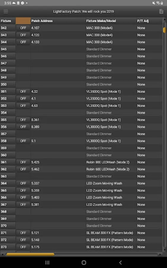 The patch tool allows the user to download patch data from a LightFactory or NEO system doe reference and editing. Once downloaded to the device you do not need to be connected to the lighting network to view or edit the patch data.