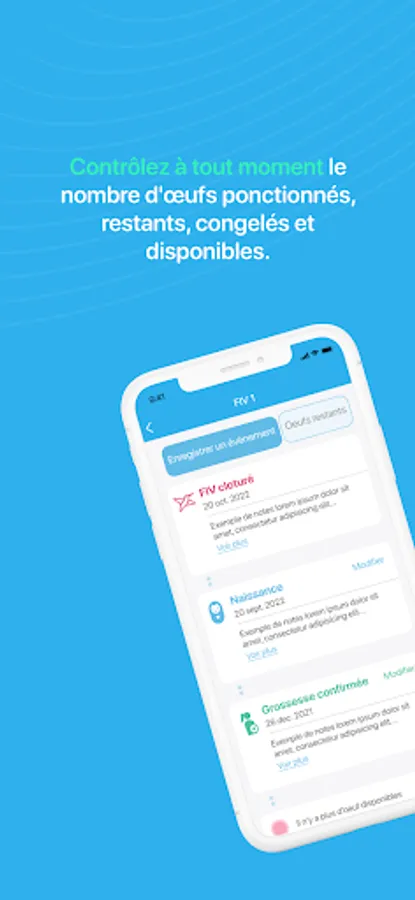 PaMAppy allows women to register an unlimited number of in vitro fertilization (IVF) cycles in the application while controlling at all times the number of eggs retrieved, remaining, frozen and available. Each IVF cycle can be updated by calculating new transferred eggs, and confirmed pregnancy date with expected birth.