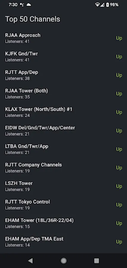 LiveATC for Android provides a quick and easy way to listen in on live conversations between pilots and air traffic controllers near many airports around the world. LiveATC for Android lets you browse by U.S. state or by country to find an airport and listen in to live air traffic conversations at or near a given airport. You can also use the "Nearby" feature to find an airport near you. You can then add any channel to your Favorites list for quick and easy access.
