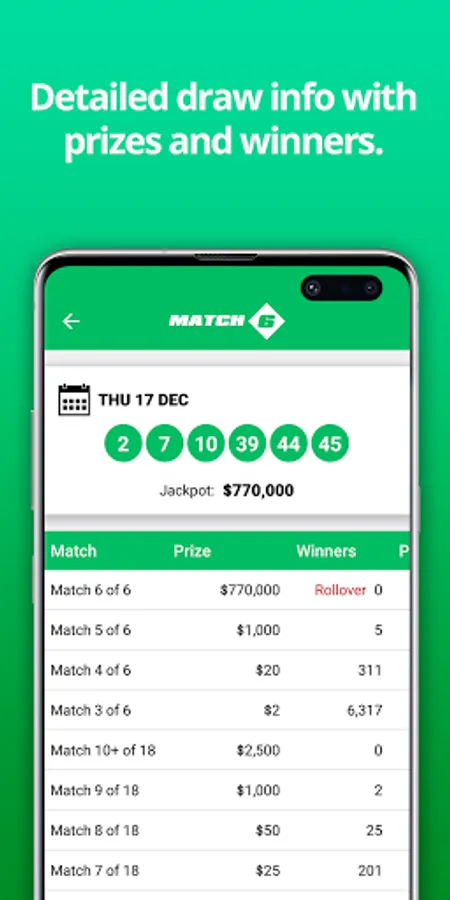 Match 6, Powerball, Mega Millions, Cash 4 Life, Cash 5 and Treasure Hunt also include a full breakdown displaying the number of winners and amount paid out for each prize level.