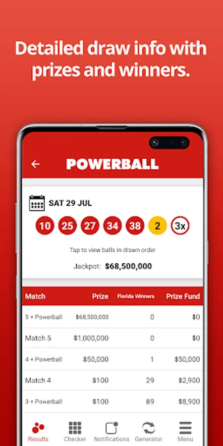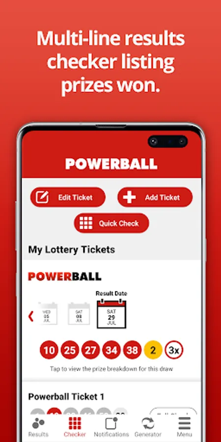 Get the latest Powerball results within moments of the draw taking place. This easy-to-use app shows the Powerball numbers (including Power Play and Double Play) and full prize breakdown including number of winners and prizes paid.