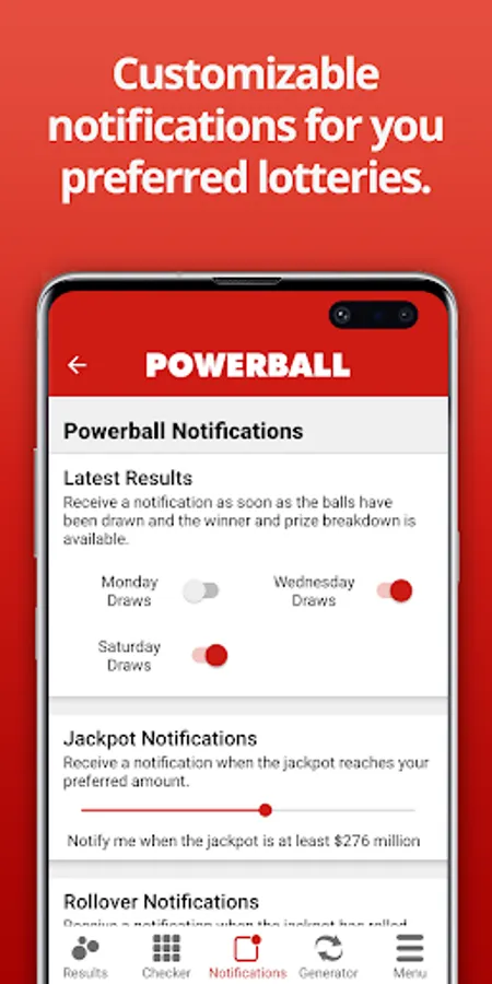 Get notified instantly when the latest lottery results and prize breakdowns become available. The App allows you to customise notifications for specific lottery games and you can also choose which days of the week you play. Want to know when the jackpot has rolled over or has reached a certain amount? Just head to the Notification section of the app to set up your alerts. There is also the option to set notifications at times that suit you - great for reminding you to purchase tickets before the draw.