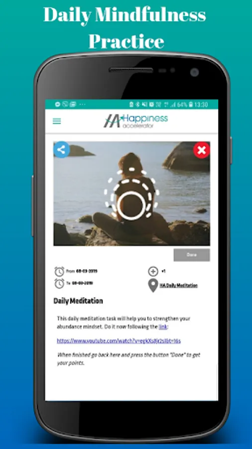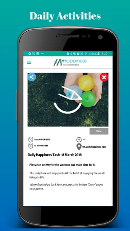 You will receive on a daily basis a task for boosting your happiness, a workout to complete, a meditation practice to listen to, as well as an inspirational thought and a funny fact. By completing them you will strengthen and build upon your inner values as: your compassion, friendship, love, accomplishment, creativity, awareness, happiness, and sense of humor.